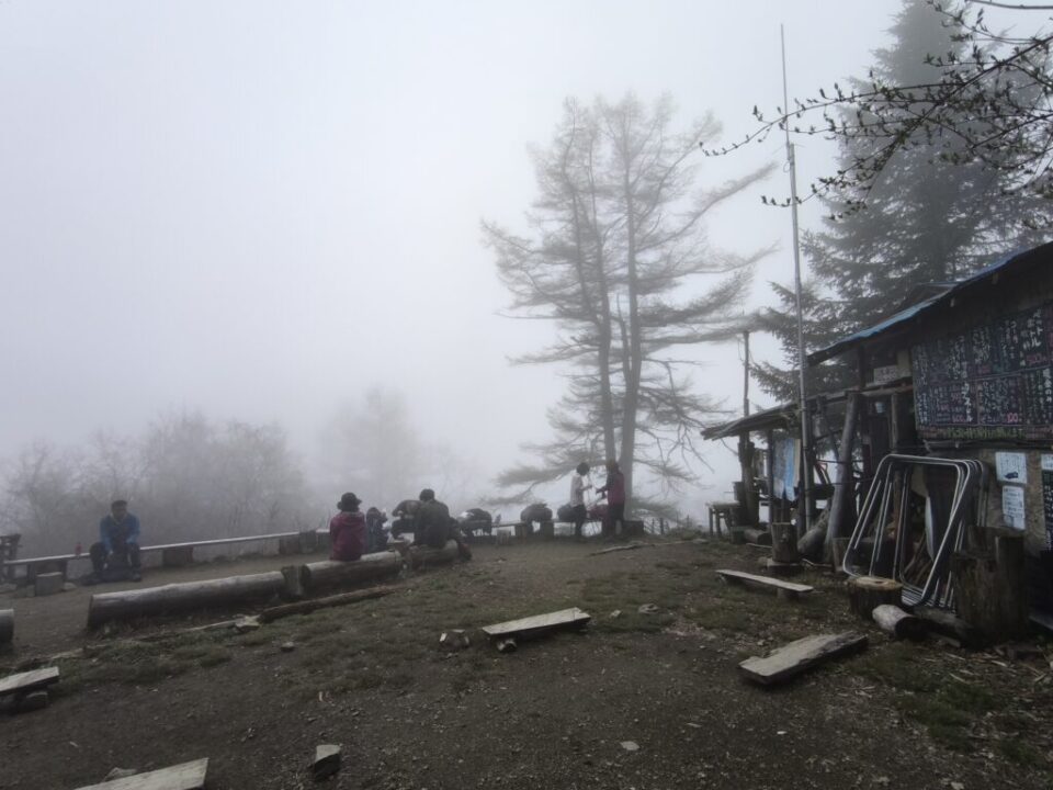 七ツ石小屋でランチ休憩。なんにも見えん! トイレ・軽食・水場・猫あります